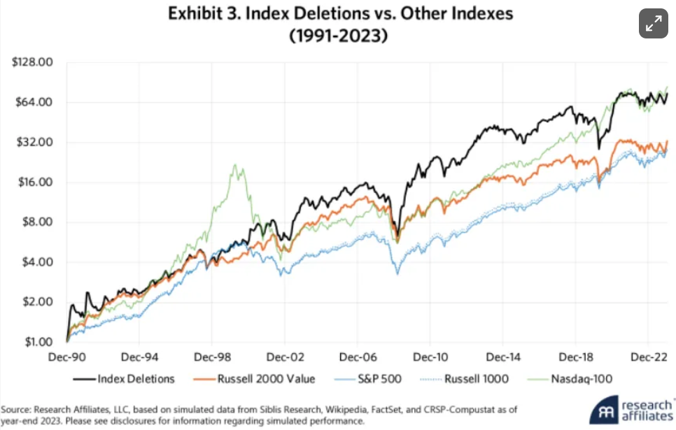 David Hay notas que as ações caíram do S&P 500 (a linha preta acima) superaram o índice em 5% ao ano nos 32 anos de 1990 a 2022 – um retorno excedente acumulado de 400%.