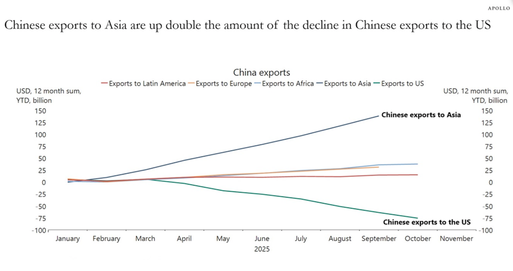Torsten Slok observa que, embora a China tenha exportado menos 75 mil milhões de dólares para os EUA até agora este ano, exportou mais 150 mil milhões de dólares para a Ásia.