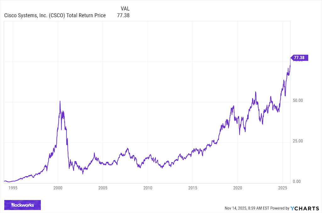 As ações da CSCO – deixadas para morrer em 2000 e há muito esquecidas – estão agora 50% acima do seu pico pontocom em termos de retorno total (dividendos reinvestidos).