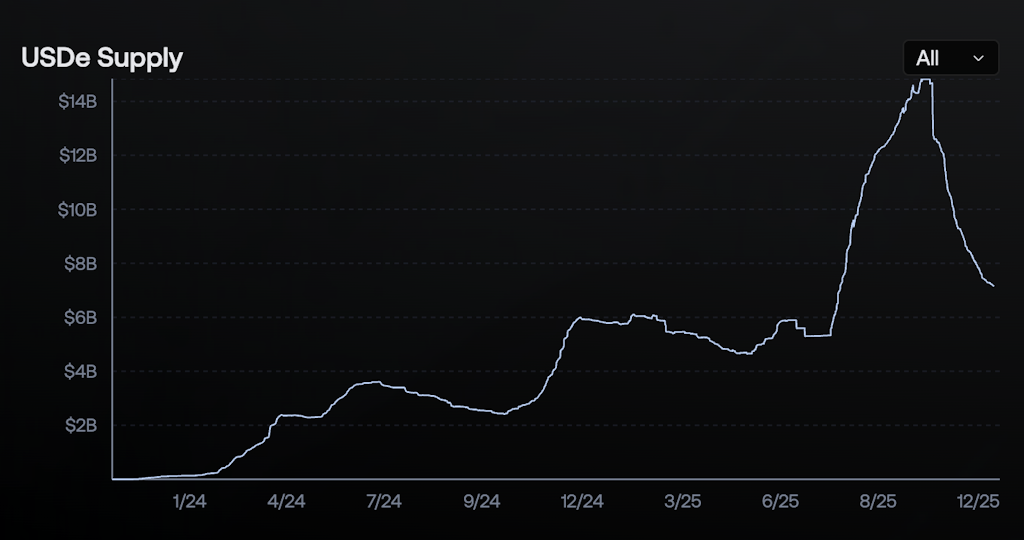 O episódio de liquidação deste ano em 11 de outubro foi o maior da história da criptografia. Um tweet sobre tarifas de Trump enviou o BTC de cerca de US$ 120 mil para cerca de US$ 102 mil e eliminou cerca de US$ 19 bilhões de dólares em posições abertas em 24 horas. USDe foi negociado a US$ 0,65 na Binance e cerca de US$ 0,92 na Bybit. Apesar disso, a Ethena processou 1,9 mil milhões de dólares em resgates, manteve o apoio total e conteve o contágio sistémico. Combinado com a exploração de US$ 1,5 bilhão da Bybit em fevereiro, este foi o segundo grande evento de estresse que o USDe passou com louvor. No entanto, apesar dessa resiliência, a oferta de USDe caiu quase 50% do pico de 14 mil milhões de dólares para cerca de 7 mil milhões de dólares.