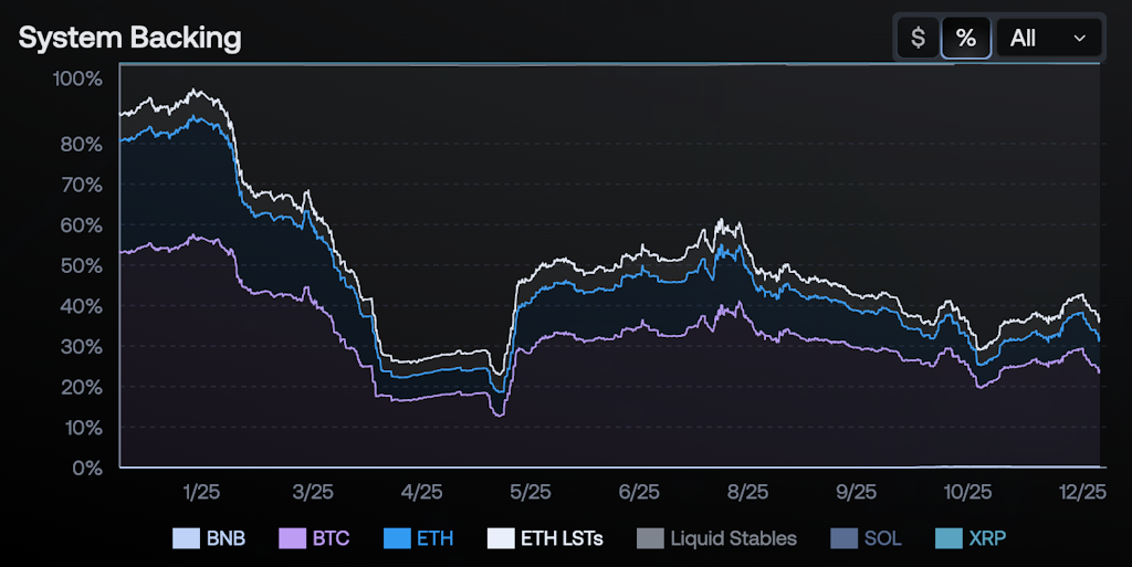 Dado que a estratégia central delta-neutral não é rentável ou apresenta rendimentos baixos, 63,3% do sistema é agora mantido em estáveis líquidos, em vez de ser implementado em transporte delta-neutro.