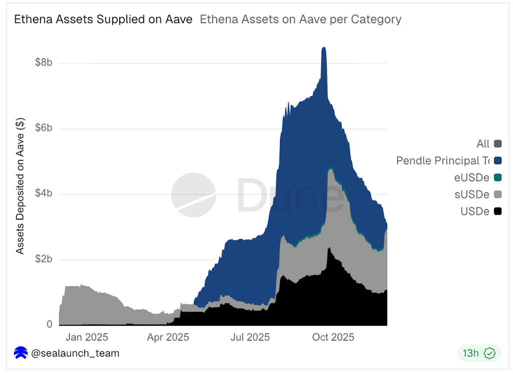- O vencimento do Pendle sUSDe PT em novembro removeu a maior parte do tamanho da Aave e a exposição caiu de mais de US$ 5,4 bilhões para cerca de US$ 340 milhões.