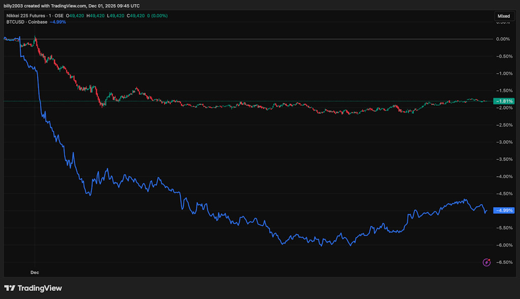 O último movimento surpreendente em meados de 2024, quando o BOJ elevou as taxas para 0,25%, levou a uma forte reversão do USD-JPY e contribuiu para uma redução de quase 30% do BTC para cerca de 49 mil, à medida que os livros macro diminuíam o risco. Um padrão semelhante apareceu hoje, com o BTC acompanhando a queda do Nikkei durante o horário da Ásia.