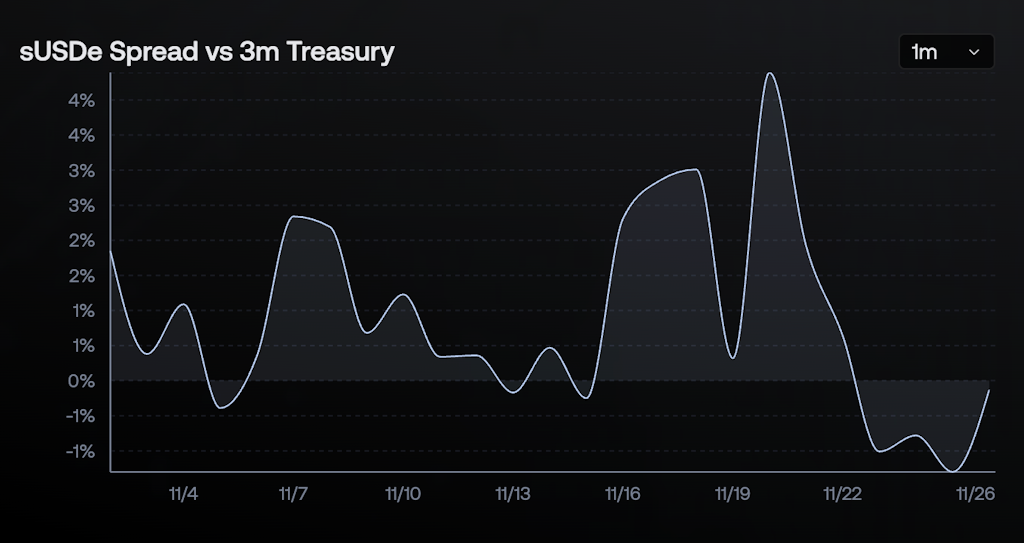 O motivo por trás disso é o transporte pouco atraente. Após a eliminação da OI em outubro, as taxas de financiamento para BTC e ETH foram alteradas para negativas, com o painel da Ethena mostrando financiamento negativo nas principais empresas. Desde novembro, o spread sUSDe tem estado abaixo dos rendimentos do Tesouro de três meses.
