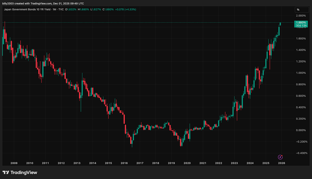 Do lado das taxas, o Japão está novamente a reactivar a redução do carry do iene. Os títulos do governo japonês de dois anos (JGBs) são negociados perto de 1%, os rendimentos de 10 anos estão em torno de 1,9%, ambos os mais altos desde 2008. Os swaps de juros noturnos agora avaliam cerca de 80% de probabilidade de um aumento em dezembro do BOJ.