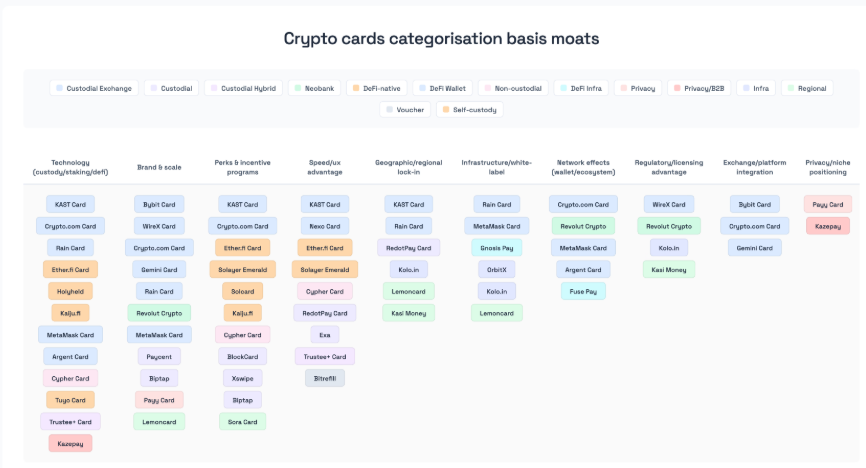Descobertas do Fundo Polaris que os cartões criptográficos e os neobancos atingiram um ponto de inflexão real, onde o valor está se afastando das recompensas e da marca em direção à infraestrutura, conformidade e controle de liquidez. A análise mostra que os fossos duráveis provêm da posse de recursos primitivos como acesso regulamentado, liquidez programável e integrações profundas, e não de reembolsos. Os provedores de infraestrutura ferroviária e os modelos de cartão nativos DeFi capturam a maior alavancagem por meio de taxas recorrentes e economia alinhada, enquanto os distribuidores CeFi enfrentam compressão de margem. À medida que a regulamentação se torna mais rigorosa, a escala favorecerá cada vez mais os intervenientes que controlam os fluxos de trabalho de licenciamento, liquidação e conformidade, em vez de incentivos voltados para o consumidor.