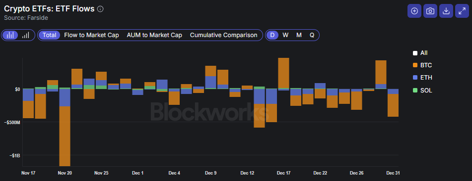 Os fluxos permanecem agitados. Em 31 de dezembro, os ETFs registraram saídas de US$ 417,8 milhões, quase compensando as entradas de US$ 428,2 milhões registradas no dia anterior.