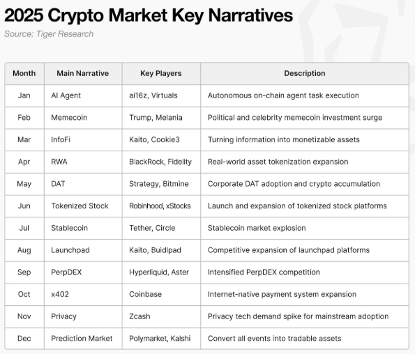 Descobertas da Tiger Research que 2025 foi definido por ciclos narrativos rápidos que geraram atenção mais rapidamente do que poderiam ser validados, levando à fadiga e ao ceticismo generalizados. A maioria das narrativas desapareceu rapidamente, mas um subconjunto traduziu-se em casos de utilização reais que impulsionaram o mercado, especialmente onde o acesso ao retalho era simples e intuitivo. Memecoins mostrou a rapidez com que os usuários podem embarcar, mas também como o engajamento é frágil sem retenção. Experimentos como o InfoFi destacaram o crescimento impulsionado por incentivos, mas expuseram problemas de qualidade e confiança. O progresso mais claro ocorreu onde a criptografia demonstrou a adequação do produto ao mercado, incluindo stablecoins, mercados de previsão e trilhos de pagamento, mostrando que o valor durável emerge apenas quando as narrativas se alinham com a utilidade real.