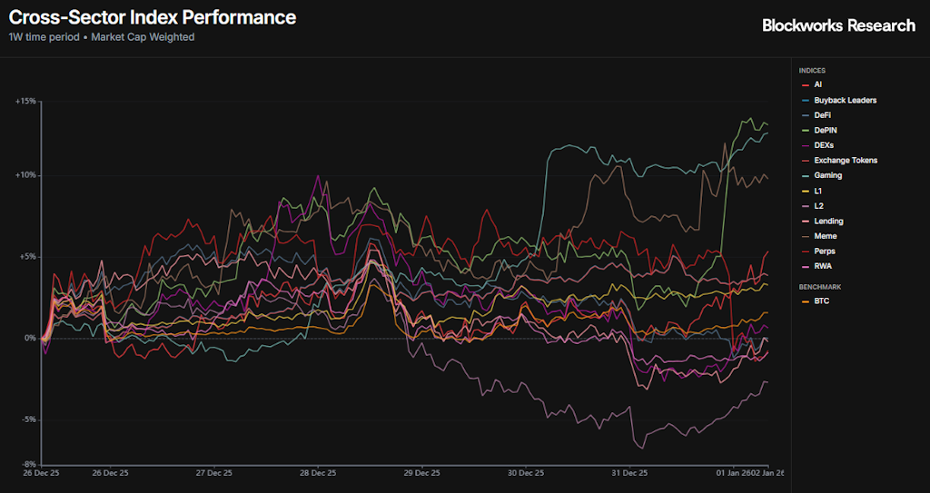 Foi uma semana mista para a criptografia, com o BTC encerrando uma divergência mais alta, mas acentuada entre os setores. DePIN e Gaming lideraram uma recuperação surpreendente após um ano difícil, enquanto L2s, RWAs e o comércio de títulos do tesouro continuaram a cair à medida que os fluxos permaneciam instáveis.