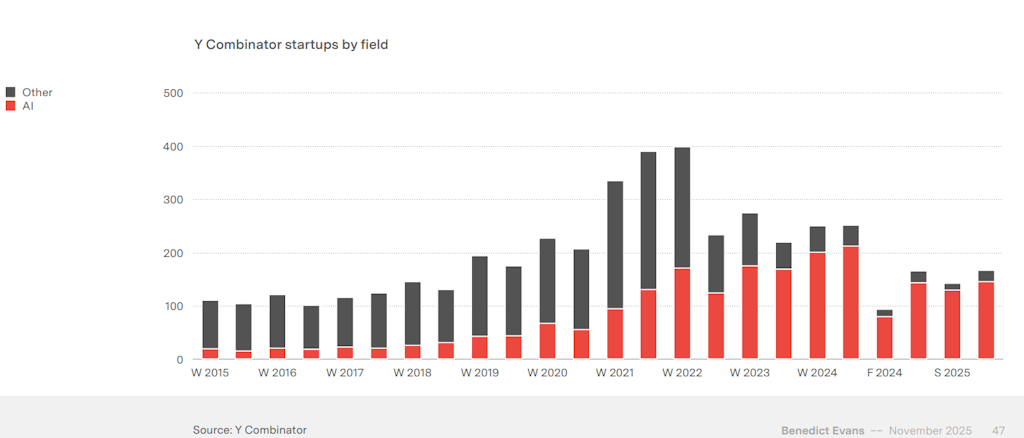 Novamente de Benedict Evans, quase todas as startups do Y Combinator estão agora relacionadas à IA.