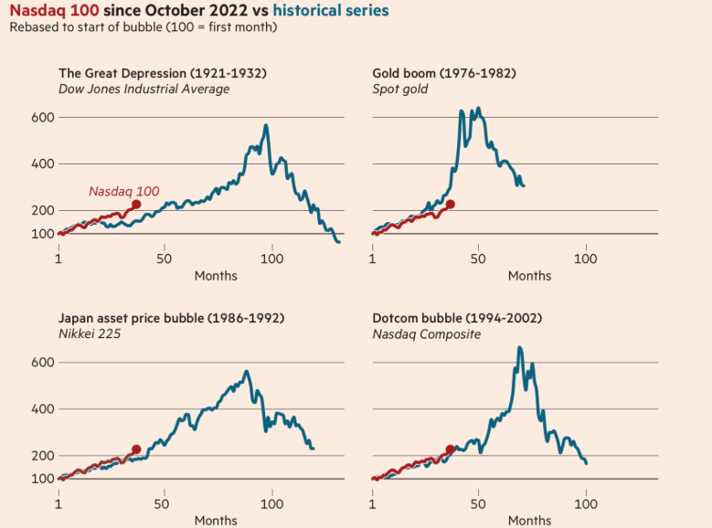 As datas de início da sobreposição de Emre Akcakmak gráficos são provavelmente um pouco arbitrários, mas seu gráfico mostra um bom argumento: se a IA é uma bolha, a história sugere que ela poderia ficar muito maior.