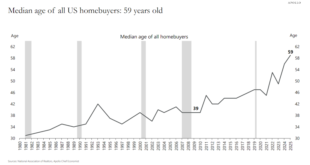 Torsten Slok observa que a idade média dos compradores de casas nos EUA é de 59 – excelente notícia porque me faz sentir à frente da curva, para variar. Por outro lado, como comprador de imóvel residencial mais jovem do que a média, posso dizer que a propriedade é superestimada e o aluguel é subestimado.