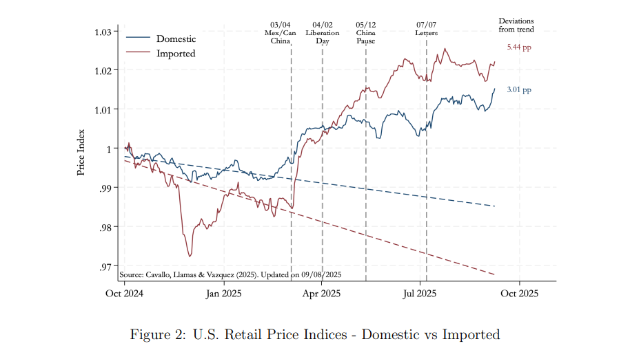 Um novo estudar dos preços dos EUA conclui que as tarifas tornaram os produtos importados 5,44% mais caros do que seriam de outra forma.