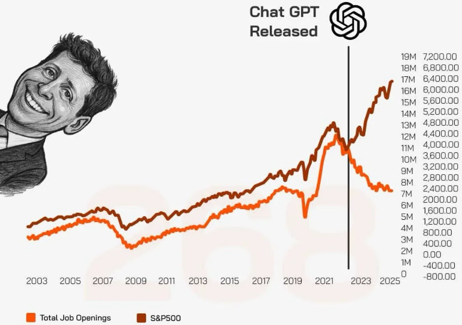 Derek Thompson notas que desde o ponto de partida do ChatGPT, o S&P500 disparou e o número de vagas de emprego nos EUA diminuiu. Não tenho certeza de quanta causalidade existe aqui, mas é um excelente gráfico.