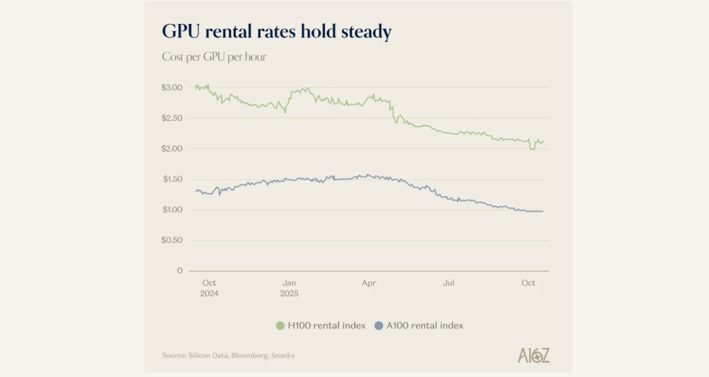 Contra Burry de a16z notas essa demanda por GPUs A100 mais antigas e menos potentes se manteve surpreendentemente bem.