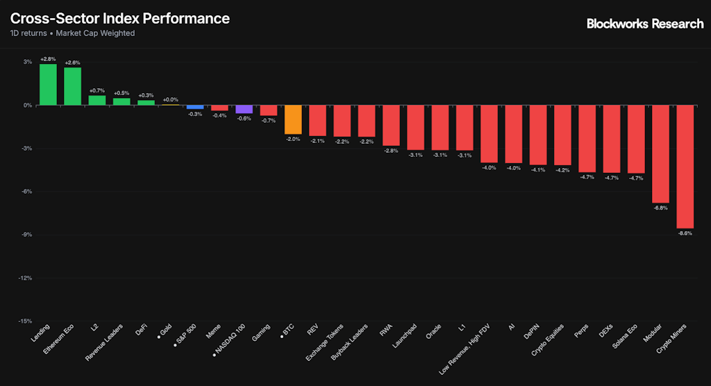 Os mercados eliminaram o risco, com o BTC caindo abaixo de US$ 86.000, apresentando desempenho inferior tanto às ações quanto ao ouro antes de uma semana movimentada em termos de dados econômicos. Apesar da desaceleração do mercado, houve pequenos bolsões de desempenho superior, com AAVE empurrando os índices Lending e Ethereum Eco para cima.
