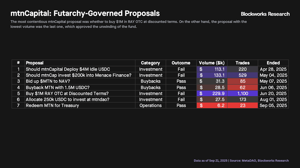Correndo o risco de soar como um recorde quebrado, este é o problema que o MetaDAO está tentando consertar e por que as “moedas de propriedade” superaram o mercado de criptografia mais amplo nos últimos meses. Embora existam muitos aspectos legais que permanecem incertos, o MetaDAO incorpora proteções mecanicistas nos tokens, com os detentores podendo enviar uma proposta de recuperação do tesouro como último recurso. A dissolução da mtnCapital demonstrou isso na prática, com os detentores resgatando MTN por USDC no tesouro quando ficou claro que a experiência havia falhado.