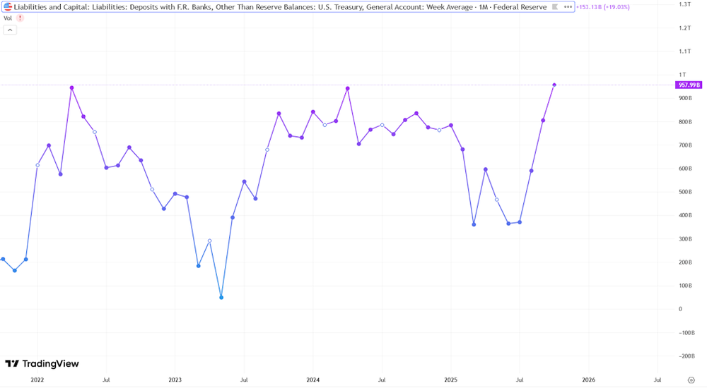 A fraqueza foi parcialmente explicada pelo aumento do saldo da Conta Geral do Tesouro (TGA), à medida que os gastos do governo dos EUA desaceleraram durante a paralisação. Saldos mais elevados de TGA drenam liquidez e têm sido um obstáculo persistente para os activos de risco nos últimos meses.