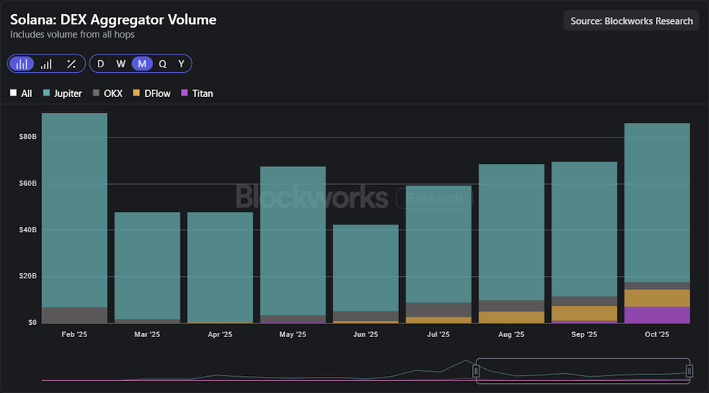 O volume total do agregador DEX em Solana atingiu cerca de US$ 86 bilhões em outubro, marcando também uma recuperação das mínimas do verão. Júpiter permaneceu dominante, mas Titan e DFlow ganharam participação de mercado significativa, registrando US$ 7,2 bilhões e US$ 7,5 bilhões, respectivamente, em volume mensal. A tendência reflete a crescente concorrência entre os agregadores DEX de Solana, à medida que novos participantes capturam uma parcela maior da atividade comercial, com os desenvolvimentos de outubro indicando que o domínio de Júpiter pode estar sob ameaça.
