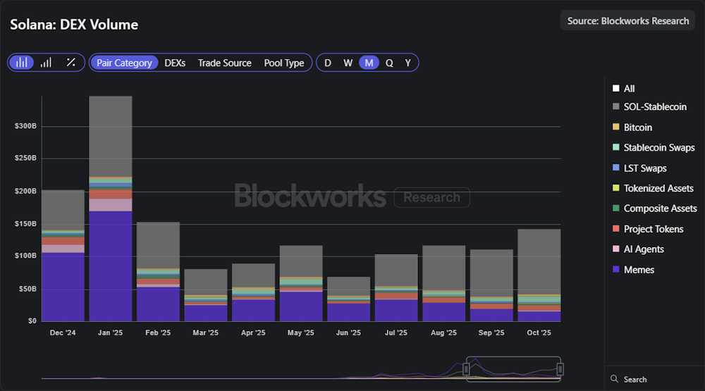 O volume mensal de DEX em Solana aumentou para ~$142 bilhões em outubro, acima dos ~$111 bilhões em setembro. A recuperação foi impulsionada principalmente pela atividade da stablecoin SOL, sinalizando algum impulso renovado em todo o ecossistema DeFi de Solana.