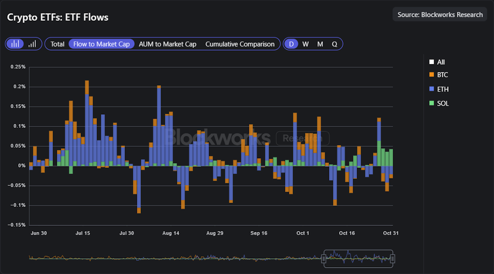 No entanto, os fluxos de ETF SOL aumentaram nos últimos dias, com uma média de cerca de +0,04% em relação ao valor de mercado por dia, as entradas mais fortes em relação ao valor de mercado na semana passada. A recuperação relativa provavelmente reflete a atenção renovada após o lançamento dos ETFs Solana na semana passada, que expandiu o acesso institucional ao ativo.