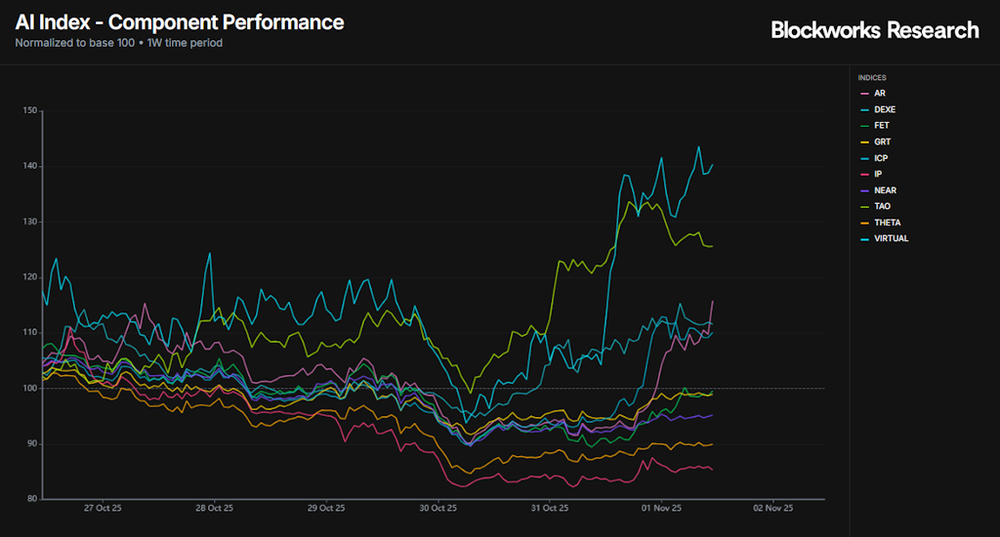 Em jogos de IA, o TAO subiu 25,6% na semana, apoiado pelo lançamento na quarta-feira do Bittensor Staked TAO ETP de Ativos Digitais Deutsche e Safello. Os investidores também precificaram o próximo halving da Bittensor por volta de 10 de dezembro, o que reduzirá as recompensas de mineração do TAO em 50%. VIRTUAL ganhou 40,6%, coincidindo com a integração da Virtuals do protocolo x402 da Coinbase para permitir micropagamentos de moeda estável entre agentes e APIs.