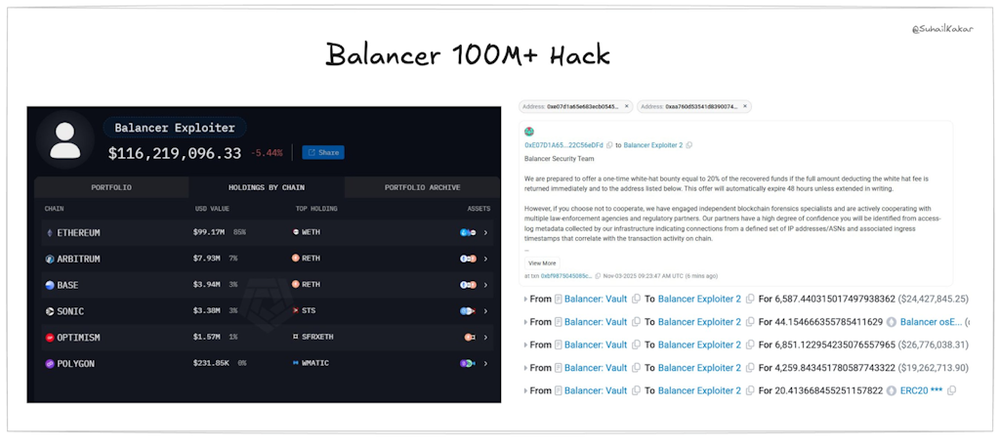 Balancer sofreu uma grande violação de segurança, com estimativas onchain mostrando US$ 100 milhões em ativos drenados. O ataque teve como alvo os pools v2 do Balancer, desencadeando saídas significativas de cofres em várias cadeias. A exploração parece ter resultado de autorização inadequada durante a configuração do pool, permitindo que invasores implantassem contratos maliciosos que manipulavam chamadas de cofre para drenar fundos entre pools conectados.