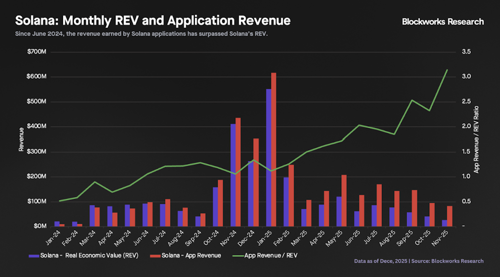 Olhando para o futuro, 2026 poderá apresentar oportunidades atraentes em tokens líquidos. Muitos nomes DeFi de qualidade estão sendo negociados perto de mínimos de vários anos, mesmo que os fundamentos e o crescimento prospectivo permaneçam fortes. Crucialmente, a captura de valor passou da infraestrutura para as aplicações: em Solana, por exemplo, as aplicações geram agora cerca de 3x a receita da rede. A questão chave para os investidores é se, e quando, as avaliações começarão a refletir esta nova realidade.