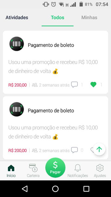 Esta promoção deve ser utilizado até o final de cada dia, tendo prazo de validade e limite máximo de cashback, isto é, geralmente eles fornecem por exemplo um valor de 10% de retorno pra carteira em um máximo de R$ 100 ou R$ 200 de transação, ou seja, talvez R$ 10 ou R$ 20 promocionais que você receberá por promoção. Vale a pena conferir!