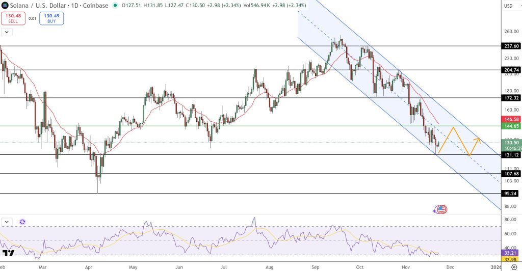 Solana está sendo negociada perto de US$ 130 hoje, se estabilizando após uma semana volátil marcada por fortes vendas e um cruzamento mortal iminente entre suas médias móveis de 50 e 200 dias.
