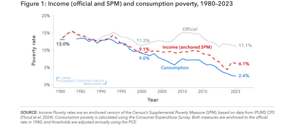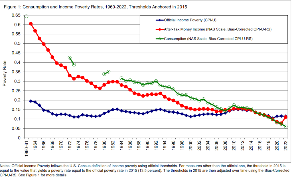 Um estudo acadêmico da “pobreza de consumo” (em verde) e da “pobreza após impostos” (em vermelho) mostra que a medida oficial da pobreza baseada no IPC não consegue captar décadas de melhoria.
