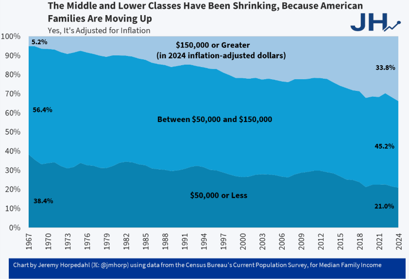 A classe média dos EUA tem vindo a diminuir, mas apenas porque a classe alta tem estado a expandir-se. Em 1967, 5,2% das famílias dos EUA ganhavam mais de 150.000 dólares (ajustados pela inflação), contra quase 34% agora.