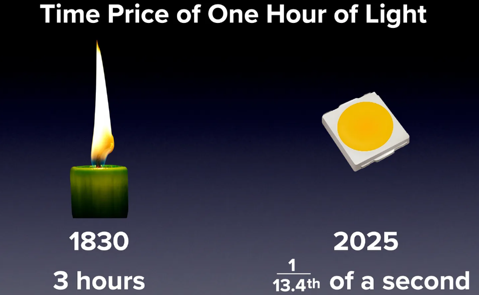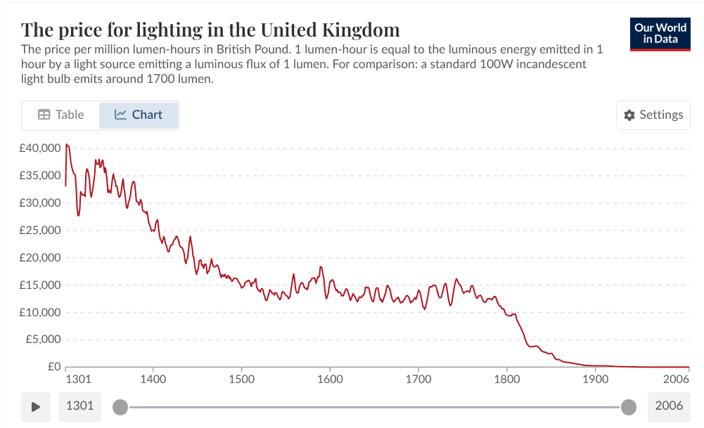 O custo de iluminar uma sala durante três horas – que exigia cerca de três horas de trabalho em 1800 – requer apenas uma fracção de segundo de trabalho agora: uma melhoria de cerca de 43.000 vezes que as estatísticas oficiais deixaram escapar quase totalmente.