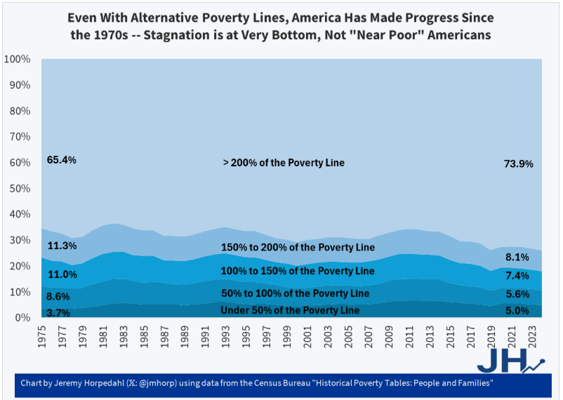 A percentagem de americanos com rendimentos superiores a 200% do limiar de pobreza federal (cerca de 60.000 dólares para uma família de quatro pessoas) aumentou 8,5 pontos percentuais desde 1975.