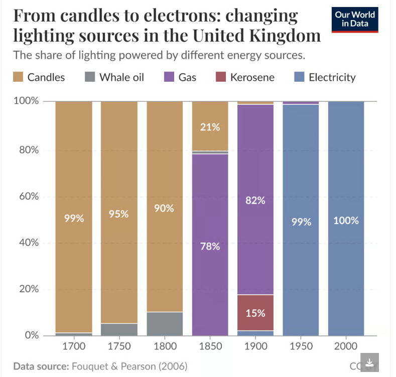 William Nordhaus tornou o progresso económico mais tangível ao calcular o “preço no tempo” da luz. Em 1830, você tinha que trabalhar três horas para permitir uma única hora à luz de velas. Hoje, você ganha a mesma hora de luz em um décimo terceiro de segundo.