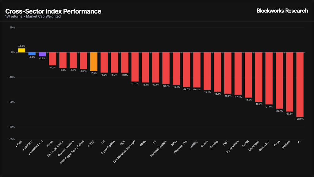 Esta semana termina com fraqueza contínua em todos os níveis, e no risco criptográfico em particular. Tanto o S&P 500 quanto o Nasdaq 100 caíram mais de -1% esta semana, com o ouro sendo o único instrumento que mostra força. Ao mesmo tempo, todos os índices criptográficos que rastreamos foram negociados em baixa ao longo da semana. Notavelmente, os tokens de exchange, os líderes de recompra e o grupo de criptomoedas de 2025 superaram o BTC durante a semana, enquanto todo o resto teve desempenho inferior.