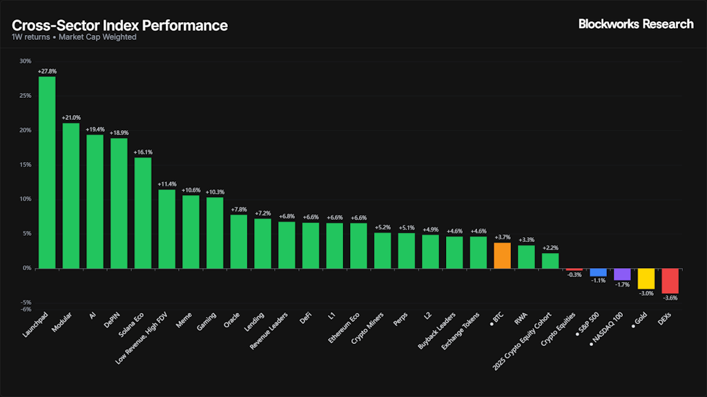 Os vencedores da semana passada concentraram-se quase inteiramente nos cantos da criptografia com beta mais alto e mais orientados para a narrativa, sinalizando uma mudança em direção ao posicionamento especulativo. Os tokens Launchpad (+27,8%) lideraram por uma ampla margem, beneficiando-se da participação renovada do varejo e do ressurgimento dos lançamentos de tokens de curta duração, à medida que os traders buscavam velocidade em relação aos fundamentos. Modular (+21,0%) e AI (+19,4%) seguiram de perto, enquanto DePIN (+18,9%) e o ecossistema Solana (+16,1%) também se destacaram.