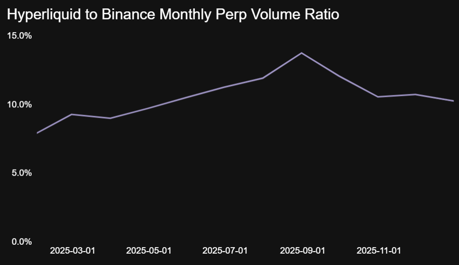 A tração inicial apóia essa visão. Desde meados de outubro, o volume de ações criminosas na Hyperliquid atingiu cerca de US$ 12,9 bilhões, com volumes diários comumente encontrados entre US$ 200 milhões e US$ 300 milhões. O Hyperliquid atualmente domina a participação de mercado, seguido pelo Lighter.