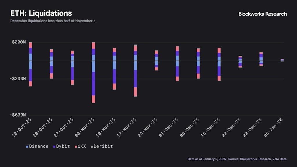 Esta reconstrução medida do posicionamento foi reforçada por um declínio contínuo na actividade de liquidação. As liquidações da ETH permaneceram moderadas ao longo de dezembro, com volumes de liquidação semanais caindo 56% em relação a novembro e bem abaixo dos extremos de desalavancagem forçada de outubro. Ambos os lados do mercado permaneceram relativamente contidos à medida que os preços se consolidavam, com as liquidações curtas ainda a excederem modestamente as posições longas, mas a níveis absolutos significativamente mais baixos. A ausência de grandes cascatas de liquidação, juntamente com o aumento dos contratos em aberto, sublinha um perfil de alavancagem mais saudável, onde as posições foram adicionadas gradualmente e o risco foi gerido de forma mais rigorosa.