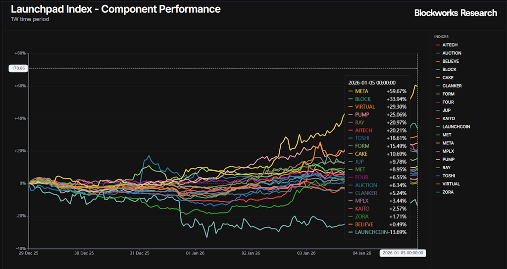 O que mais se destacou foi a amplitude: quase todos os constituintes do índice terminaram em alta na semana, ressaltando o quão sincronizado foi o movimento em todo o complexo. A única exceção foi o Launchcoin, que ficou para trás enquanto o resto do grupo participou da alta. Esse tipo de participação quase universal é normalmente um sinal de posicionamento a nível sectorial, em vez de notícias simbólicas idiossincráticas. Olhando para o futuro, a configuração continua a ser convincente, com os quadros regulamentares a cristalizarem-se em 2026 e a infra-estrutura de lançamento compatível provavelmente passar de um nicho especulativo para um pilar estrutural da pilha de criptografia, tornando os Launchpads uma área à qual os investidores serão cada vez mais forçados a prestar atenção em vez de negociar de forma oportunista.