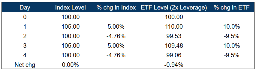 Mas os ETFs alavancados têm falhas: dependem de derivados para redefinir a exposição diariamente, o que introduz um obstáculo à volatilidade. Mesmo quando o índice subjacente não chega a lugar nenhum, os ETFs alavancados podem perder valor com o tempo. Esses produtos são projetados para negociação de curto prazo, mas são amplamente mal compreendidos e mantidos por mais tempo do que o pretendido.