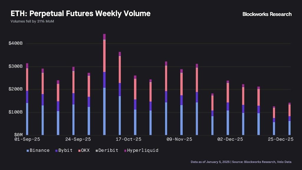 Os mercados de derivativos de ETH em dezembro de 2025 foram definidos por uma clara divergência entre participação e posicionamento. Os volumes de futuros perpétuos continuaram a esfriar, com o volume agregado de perps de ETH caindo cerca de 31% mês após mês, estendendo o declínio de novembro e refletindo o enfraquecimento da intensidade especulativa em meio à consolidação e à volatilidade comprimida. A atividade caiu amplamente nos principais locais, sinalizando um apetite reduzido por negociações direcionais de curto prazo, especialmente durante a menor liquidez nos feriados.