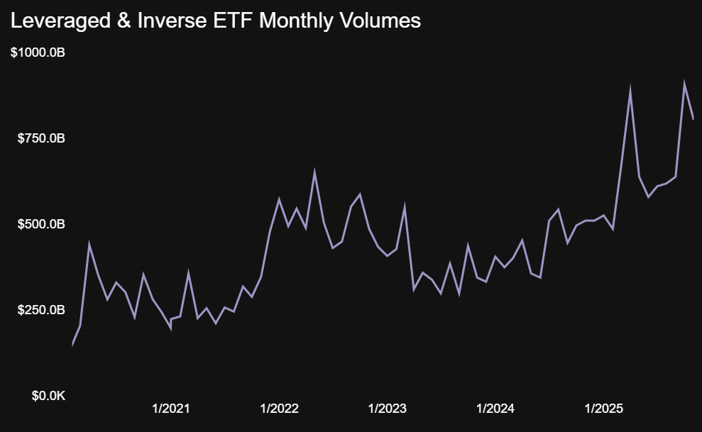 JPMorgan estimativas os fluxos de ações de varejo em 2025 são mais de 50% superiores aos de 2024 e acima do pico de estoque de meme de 2021. Os ETFs alavancados absorveram grande parte desse apetite, com AUM crescente de US$ 41,6 bilhões em 2020 para US$ 250 bilhões no final de 2025, e volumes mensais de negociação superiores a US$ 800 bilhões.
